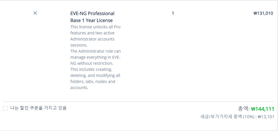 EVE-NG Professional(유료) - 할인쿠폰 없이 1년에 14만원 입니다.