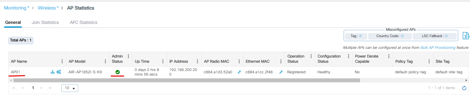 아래 사진처럼 AP01이 WLC에 등록이 되었고 Admin Status를 표시면 초록색으로 정상적입니다.
