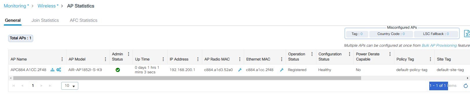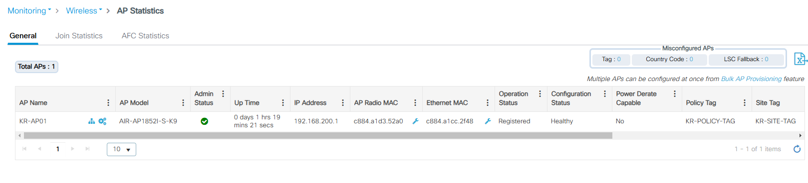 현재 AP 한대가 WLC에 등록 되어져 있습니다.