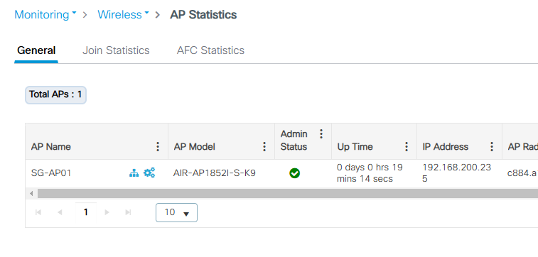3. 현재 아래처럼 AP한대가 WLC에 등록 되어져 있습니다.