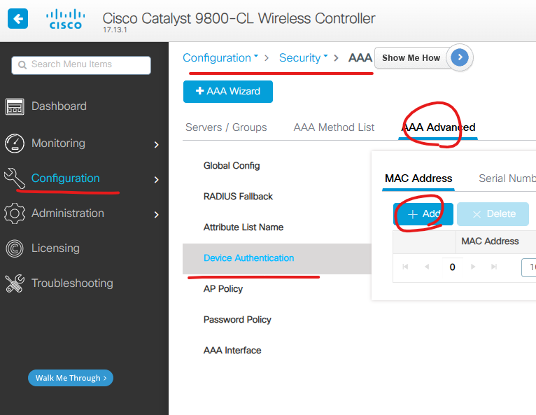 Configuration -> Security -> AAA -> AAA Advanced -> Device Authentication -> MAC Address -> Add 버튼을 클릭 합니다.
