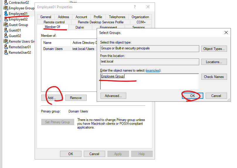 위에처럼 유저를 생성하고 나머지 유저들도 생성하고 그룹에 할당합니다.