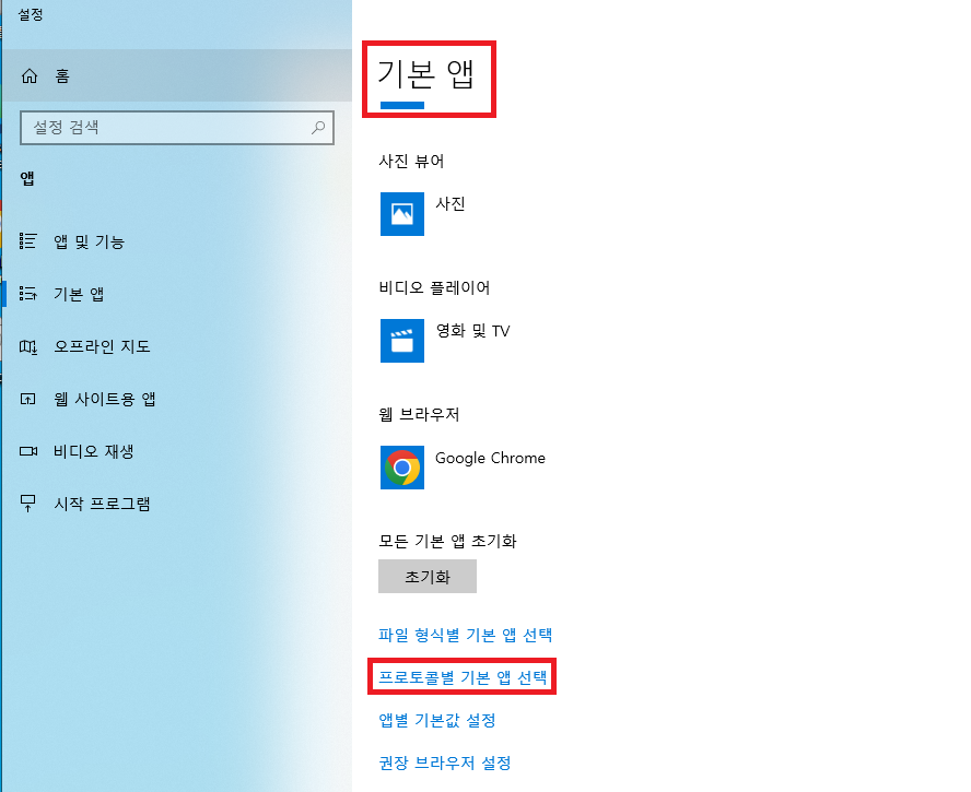 기본 앱 -> 프로토콜별 기본 앱 선택 ->