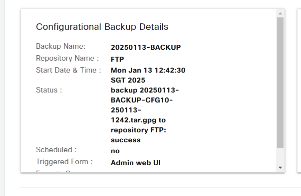 ISE01/admin#show backup history Mon Jan 13 12:52:40 +08 2025: backup 20250113-BACKUP-CFG10-250113-1242.tar.gpg to repository FTP: success ISE01/admin# |
