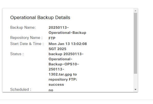ISE01/admin#show backup status %% Configuration backup status %% ---------------------------- % backup name: 20250113-BACKUP % repository: FTP % start date: Mon Jan 13 12:42:30 SGT 2025 % scheduled: no % triggered from: Admin web UI % host: ISE01.test.local % status: backup 20250113-BACKUP-CFG10-250113-1242.tar.gpg to repository FTP: success %% Operation backup status %% ------------------------ % backup name: 20250113-Operational-Backup % repository: FTP % start date: Mon Jan 13 13:02:08 SGT 2025 % scheduled: no % triggered from: Admin web UI % host: ISE01.test.local % status: backup 20250113-Operational-Backup-OPS10-250113-1302.tar.gpg to repository FTP: success ISE01/admin# |