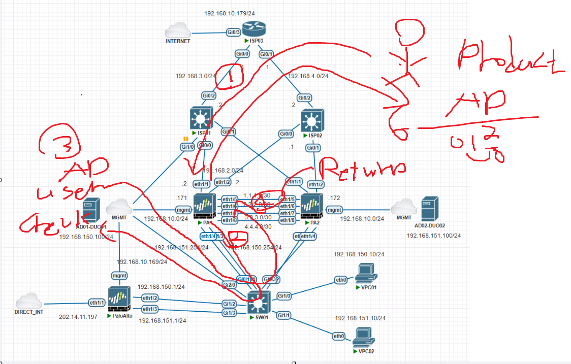 Aysmetric 구조가 아니고 PA AD/DUO source interface로 패킷이 나가서 라우팅만 잘 되고 다시 그 인터페이스로 패킷을 전달 받으면 제대로 동작하는 것을 확인 하였습니다.