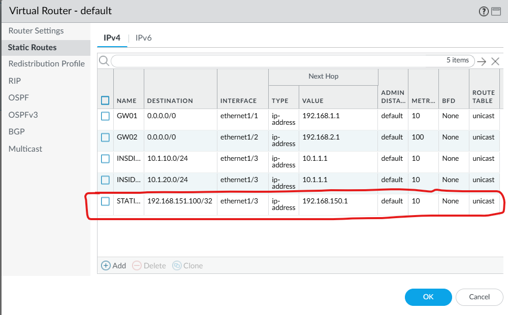 GP PA1에서 단순히 Static Routing를 아래처럼 설정하면 됩니다.