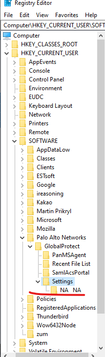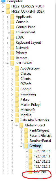 Windows Registry Editor Version 5.00 ; @ECHO OFF ; CLS ; REGEDIT.EXE /S "%~f0" ; EXIT [HKEY_CURRENT_USER\SOFTWARE\Palo Alto Networks\GlobalProtect\Settings\192.168.1.2] [HKEY_CURRENT_USER\SOFTWARE\Palo Alto Networks\GlobalProtect\Settings\192.168.1.3] [HKEY_CURRENT_USER\SOFTWARE\Palo Alto Networks\GlobalProtect\Settings\192.168.2.2] [HKEY_CURRENT_USER\SOFTWARE\Palo Alto Networks\GlobalProtect\Settings\192.168.2.3] |