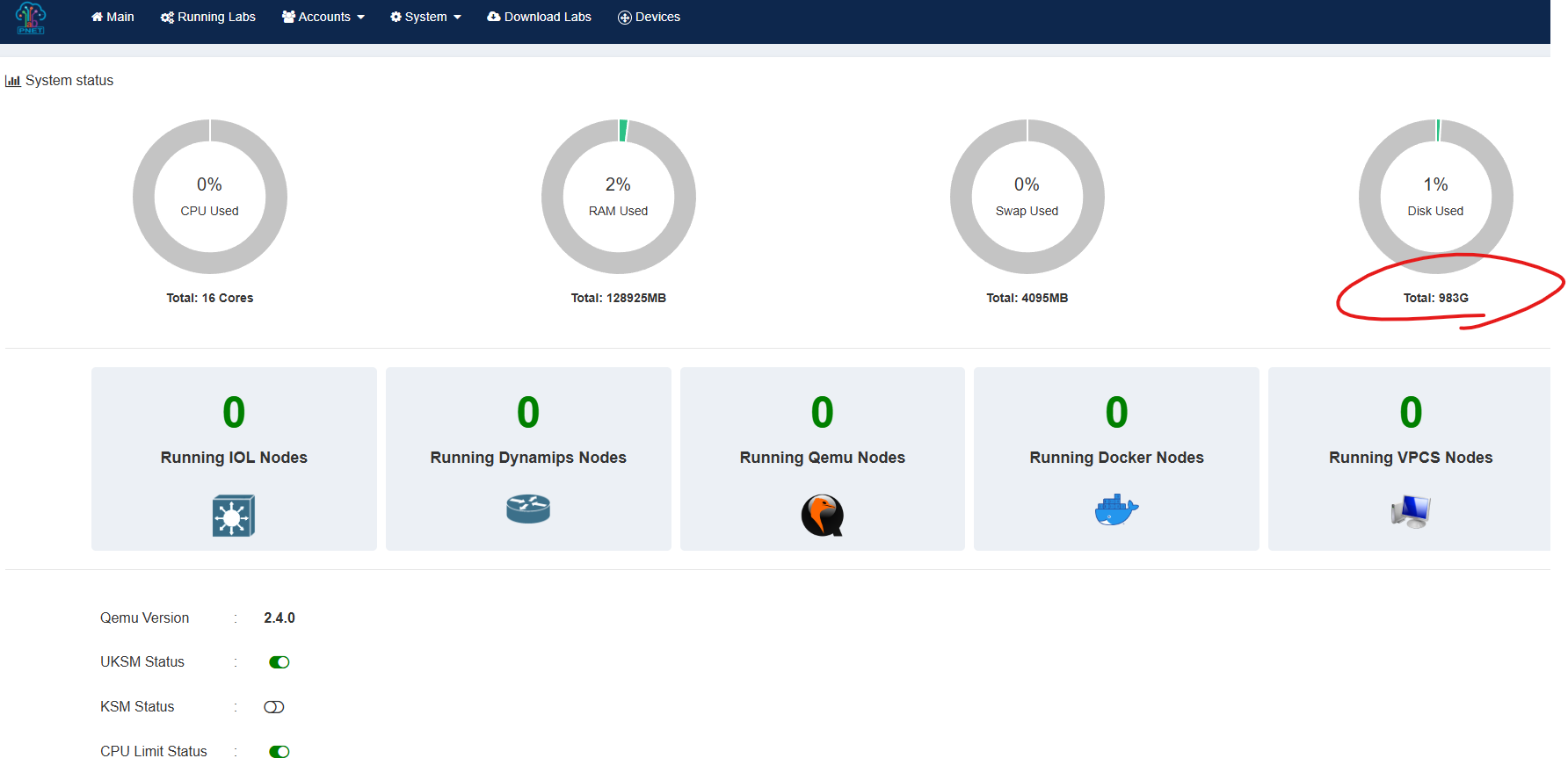 설치 할때 1T 설정 하였는데, 기본 하드 디스크1은 디폴트로 100G로 fix되어져 있어서 디스크 사이즈를 수정해도 실제 PNETlab안에 disk size가 수정되지 않습니다.