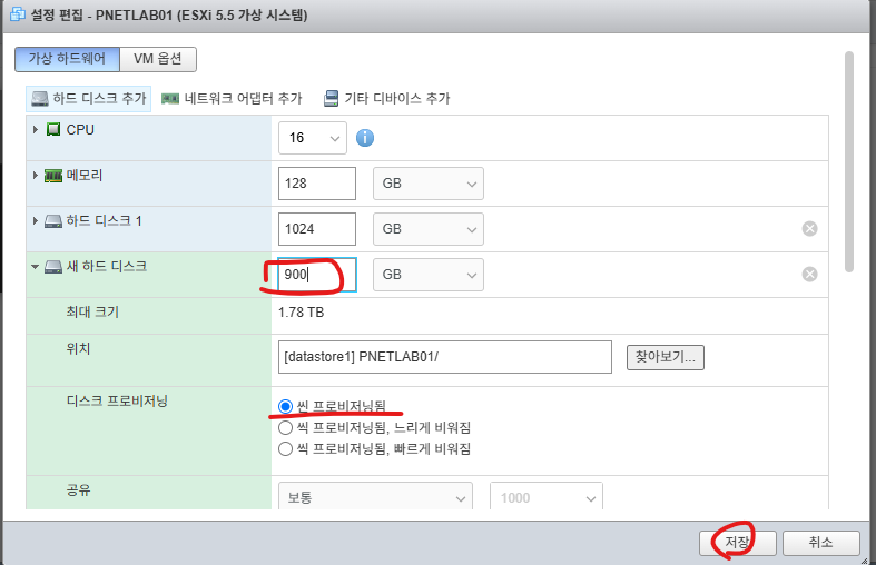 그리고 디스크 프로비저닝은 씬 프로비저닝을 선택하고 저장 버튼을 클릭 합니다.