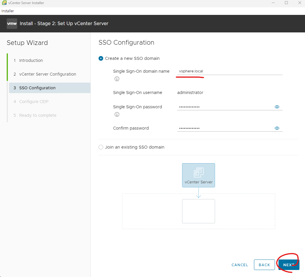 18.아래처럼 SSO domain를 vsphere.local로 생성하고 administrator 비밀번호를 입력합니다.