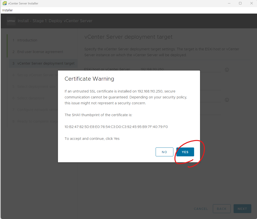 7. vCenter는 ESXi안에 설치 되기 떄문에, 아래 처럼 ESXi IP주소랑 계정 정보를 입력하고 Next버튼을 클릭 합니다.