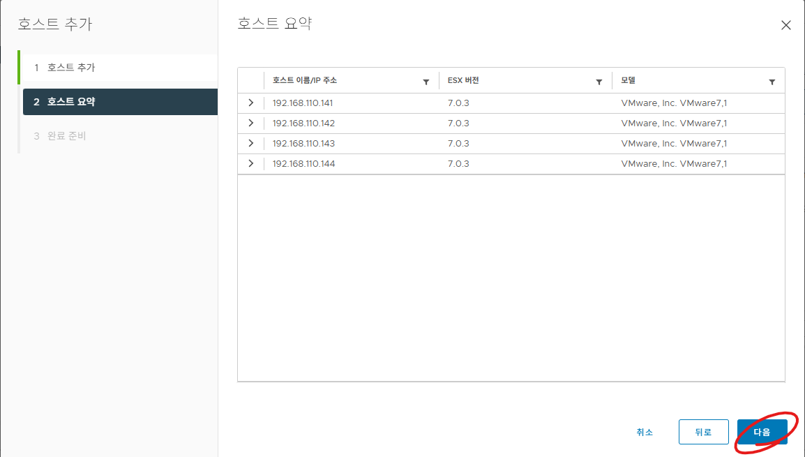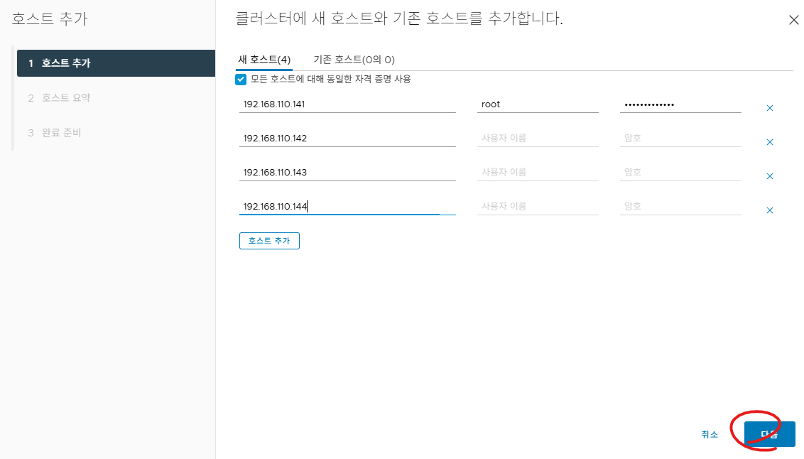 8. 저는 호스트가 4대가 있어서 아래처럼 등록하고 로그인 정보를 입력 하였습니다. 그리고 다음 버튼을 클릭 합니다.