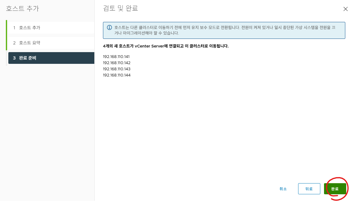 12. 호스트가 등록 되었고 유지보수 모드로 동작합니다. 마저 클러스터 구성을 합니다.