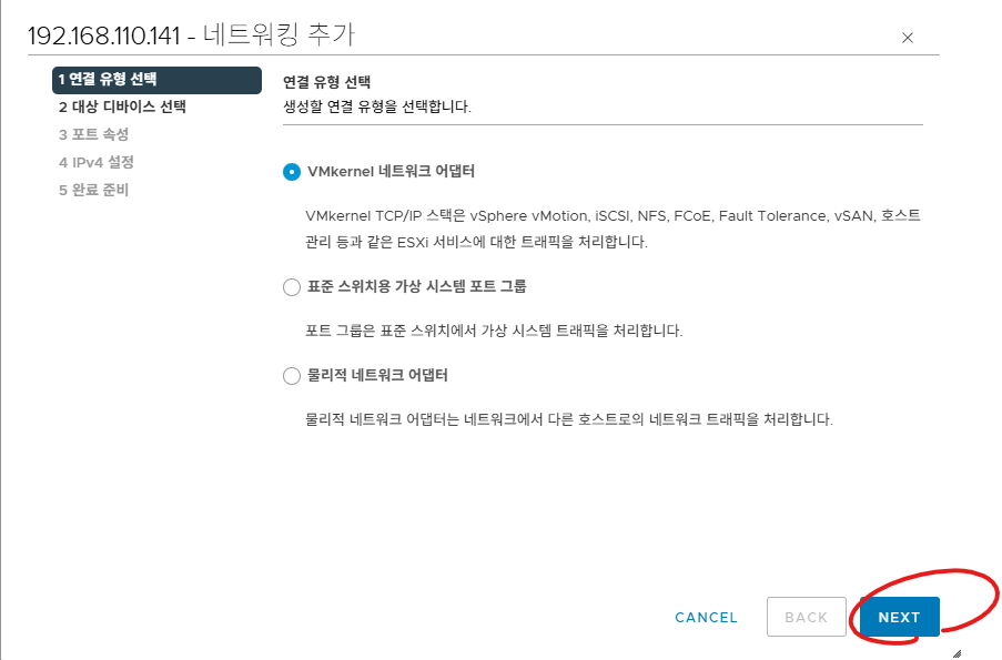 첫번째 호스트 선택 -> 구성 -> VMknerrel 어댑터 선택 -> 네트워킹 추가 버튼을 클릭 합니다.