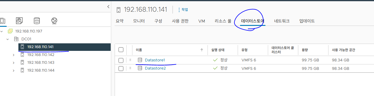 1. vCenter에 접속 합니다. Host IP선택 -> 데이터스토어 -> Datastore1를 선택합니다.