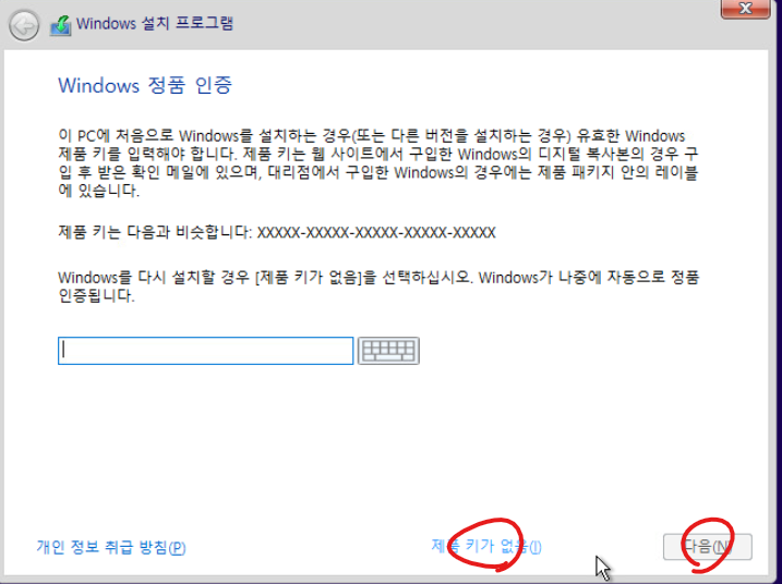 7. 제품키가 없음을 선택하고 다음 버튼을 클릭합니다.