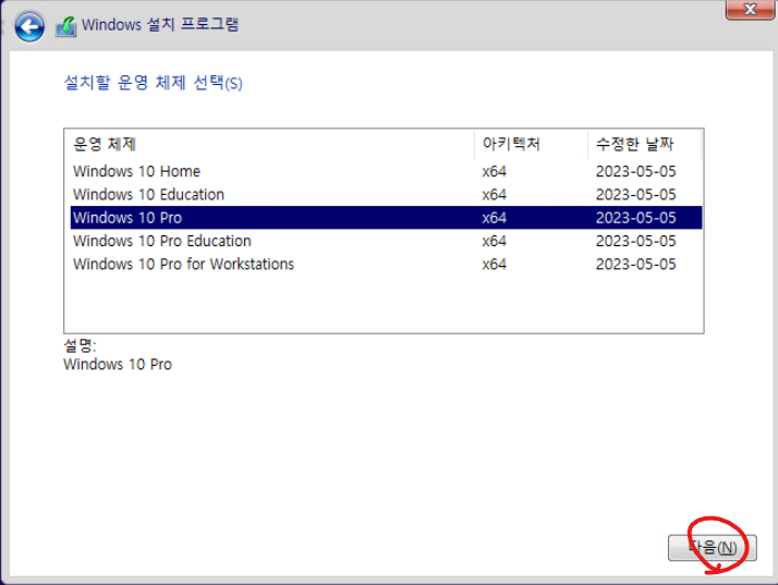 8. 윈도우 10 프로를 선택하고 아래 다음 버튼을 클릭합니다.