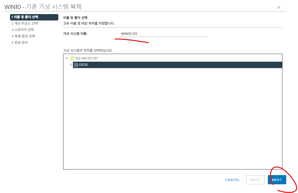 4. 3번 VMware ESXi호스트를 선택하고 Next버튼을 클릭합니다.