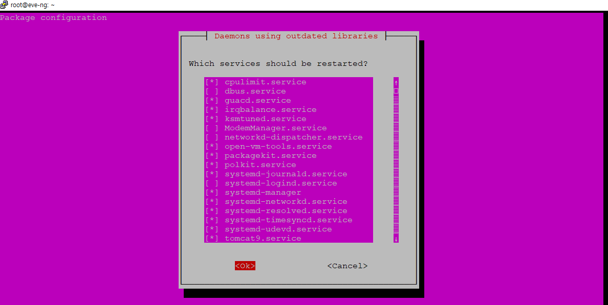 | root@eve-ng:~# apt upgrade Reading package lists... Done Building dependency tree... Done Reading state information... Done Calculating upgrade... Done Get more security updates through Ubuntu Pro with 'esm-apps' enabled: libavcodec58 libmagickwand-6.q16-6 libavutil56 libswscale5 libmagickcore-6.q16-6 libswresample3 imagemagick-6-common libavformat58 libde265-0 Learn more about Ubuntu Pro at https://ubuntu.com/pro The following NEW packages will be installed: linux-headers-5.15.0-112 linux-headers-5.15.0-112-generic linux-image-5.15.0-112-generic linux-modules-5.15.0-112-generic linux-modules-extra-5.15.0-112-generic ubuntu-pro-client The following packages have been kept back: python3-update-manager update-manager-core The following packages will be upgraded: apt apt-utils bash bind9-dnsutils bind9-host bind9-libs binutils binutils-common binutils-x86-64-linux-gnu bsdextrautils bsdutils cloud-init coreutils cpio curl distro-info-data dpkg eject ethtool eve-ng fdisk firmware-sof-signed ghostscript git git-man intel-microcode klibc-utils landscape-common less libapt-pkg6.0 libarchive13 libbinutils libblkid1 libc-bin libctf-nobfd0 libctf0 libcurl3-gnutls libcurl4 libexpat1 libfdisk1 libgdk-pixbuf-2.0-0 libgdk-pixbuf2.0-bin libgdk-pixbuf2.0-common libgif7 libglib2.0-0 libglib2.0-bin libglib2.0-data libgnutls30 libgpgme11 libgs9 libgs9-common libklibc libldap-2.5-0 libldap-common libmount1 libnghttp2-14 libnspr4 libnss3 libsmartcols1 libssl3 libtiff5 libtss2-esys-3.0.2-0 libtss2-mu0 libtss2-sys1 libtss2-tcti-cmd0 libtss2-tcti-device0 libtss2-tcti-mssim0 libtss2-tcti-swtpm0 libuuid1 libuv1 libvpx7 libvte-2.91-0 libvte-2.91-common libxml2 linux-firmware linux-generic linux-headers-generic linux-image-generic linux-libc-dev locales mount mysql-client-8.0 mysql-client-core-8.0 mysql-server mysql-server-8.0 mysql-server-core-8.0 openjdk-11-jdk openjdk-11-jdk-headless openjdk-11-jre openjdk-11-jre-headless openssh-client openssh-server openssh-sftp-server openssl python3-cryptography python3-idna python3-jinja2 qemu-block-extra qemu-system-common qemu-system-data qemu-system-gui qemu-system-x86 qemu-utils snapd tcpdump tzdata ubuntu-advantage-tools ubuntu-pro-client-l10n update-notifier-common util-linux uuid-runtime vim vim-common vim-runtime vim-tiny xxd 116 upgraded, 6 newly installed, 0 to remove and 2 not upgraded. 86 standard LTS security updates Need to get 648 MB of archives. After this operation, 589 MB of additional disk space will be used. Do you want to continue? [Y/n] |