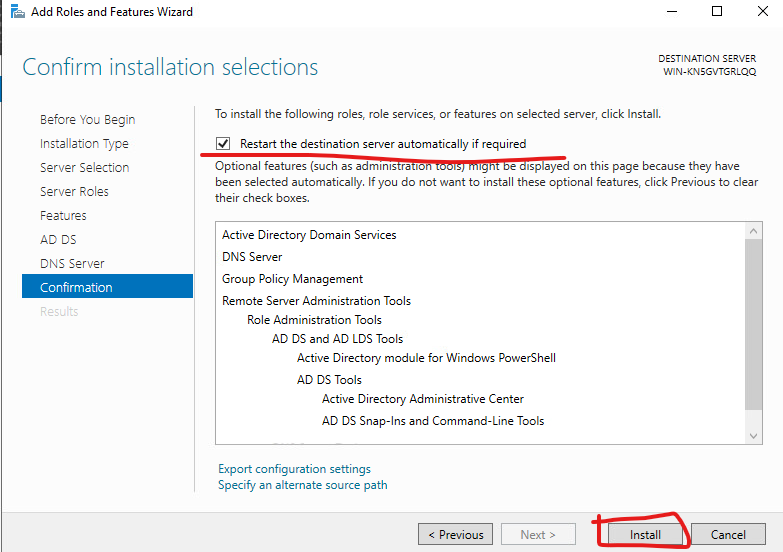 16. Restart The destination server 를 선택하고 Install 버튼을 클릭 합니다.