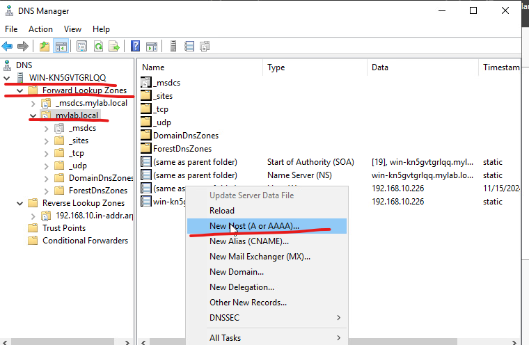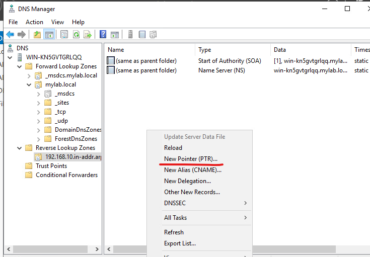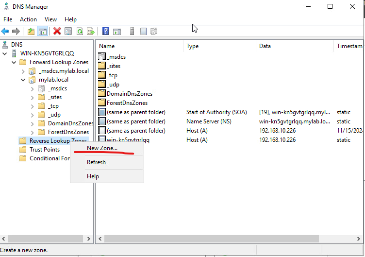 31. DNS Manager를 선택하고 Reverse Lookup Zone를 생성합니다.
