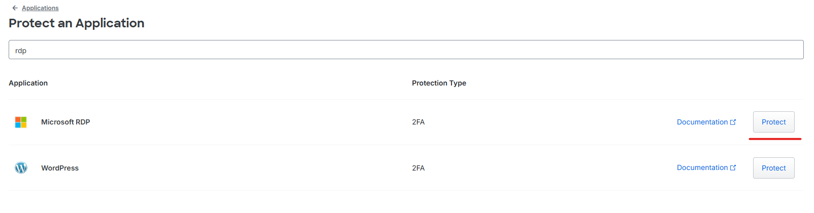 3. 그리고 RDP를 검색합니다. 그리고 Protect버튼을 클릭 합니다.