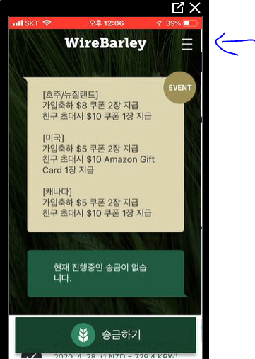 홈페이지에서 송금버튼을 누르면 아래와 같은 메시지를 확인 할수 있습니다.