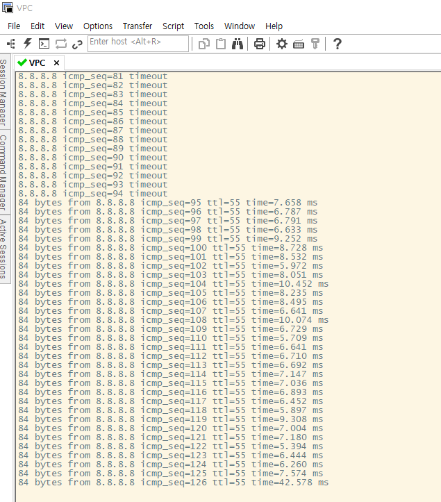 | VPCS> ping 8.8.8.8 -c 10000 84 bytes from 8.8.8.8 icmp_seq=1 ttl=55 time=25.751 ms 84 bytes from 8.8.8.8 icmp_seq=2 ttl=55 time=8.481 ms |