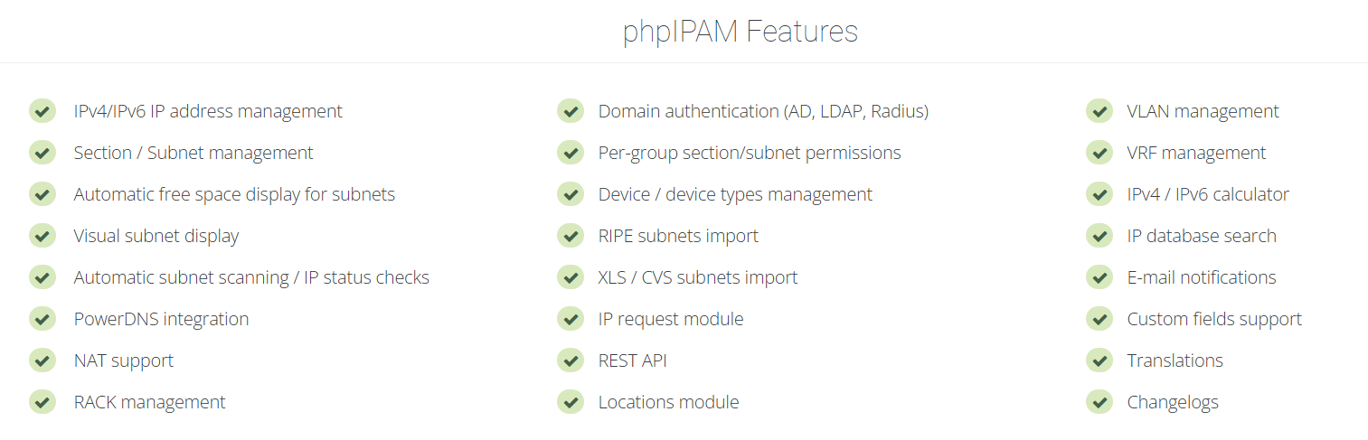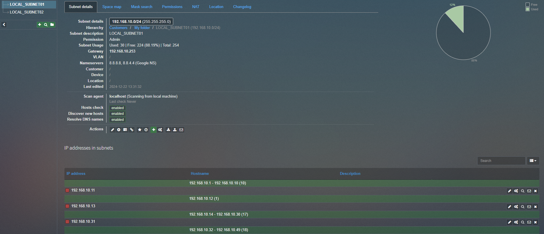 phpipam is an open-source web IP address management application (IPAM). Its goal is to provide light, modern and useful IP address management. It is php-based application with MySQL database backend, using jQuery libraries, ajax and HTML5/CSS3 features.