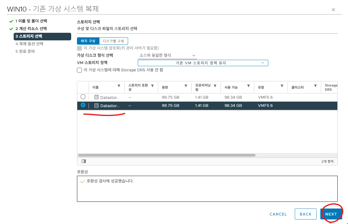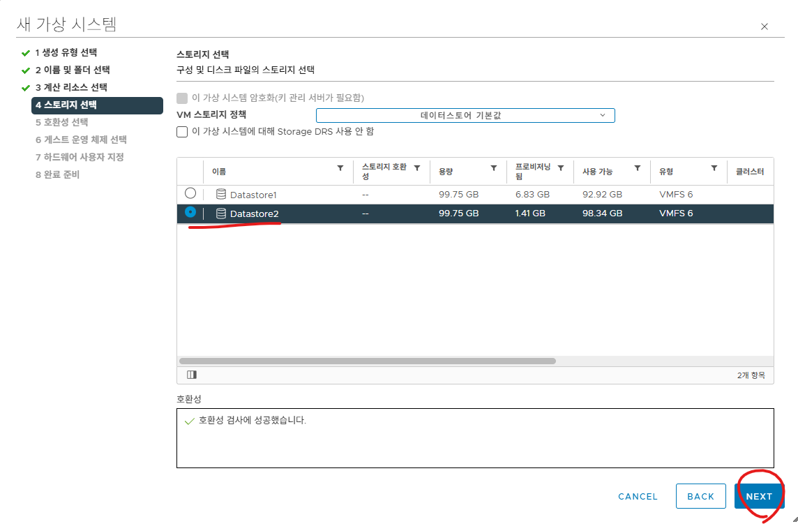 4. 2번째 스토리지를 선택하고 next버튼을 클릭합니다.