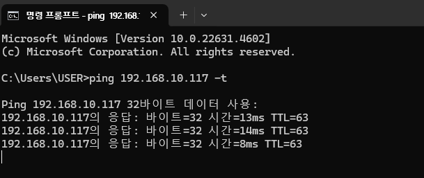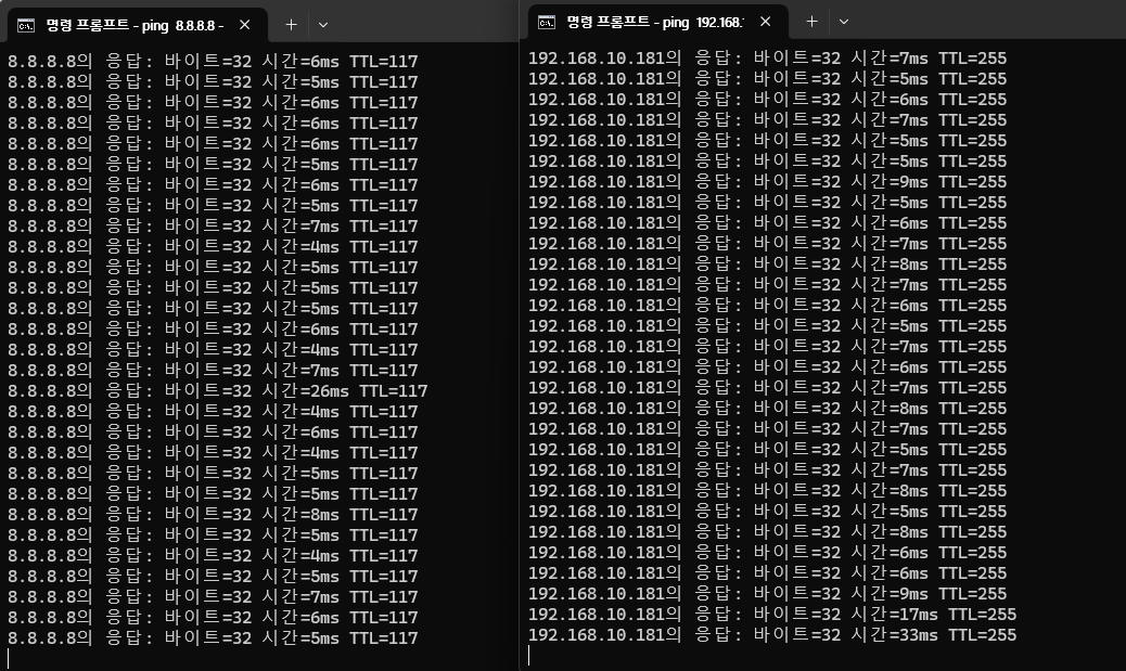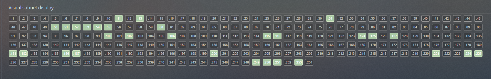초록색이 현재 사용중인 IP주소를 표시 됩니다. 192.168.10.0/24 대역중에서 어떤 IP주소가 사용 중인지 확인 가능 합니다.