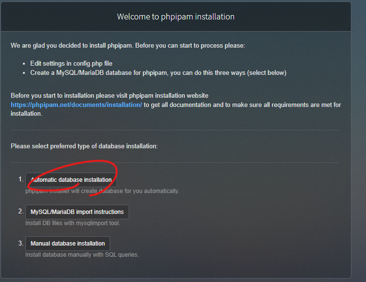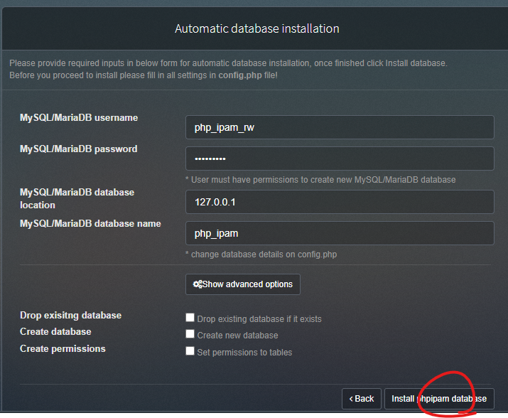 CREATE DATABASE php_ipam; GRANT ALL ON php_ipam.* to 'php_ipam_rw'@'localhost' IDENTIFIED BY 'P4P1p@m!!'; FLUSH PRIVILEGES; EXIT; exit