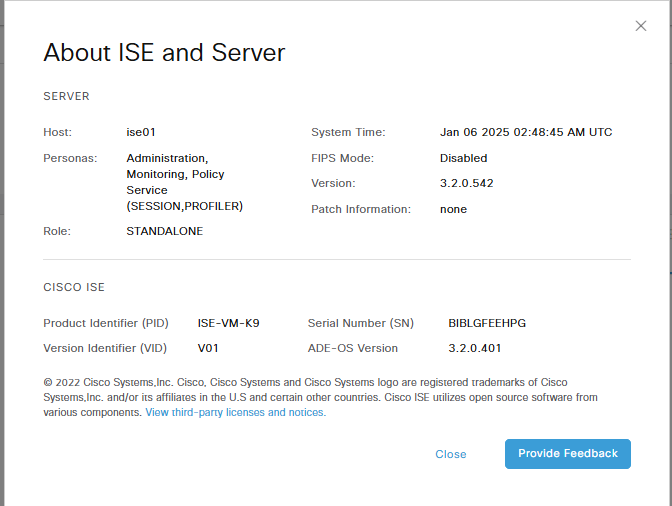 Cisco Identity Services Engine --------------------------------------------- Version : 3.2.0.542 Build Date : Thu Oct 20 00:27:24 2022 Install Date : Tue Dec 31 12:37:28 2024