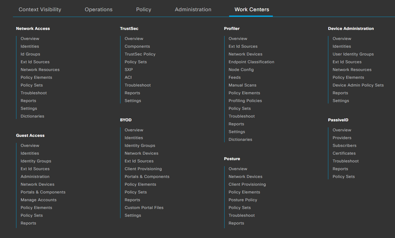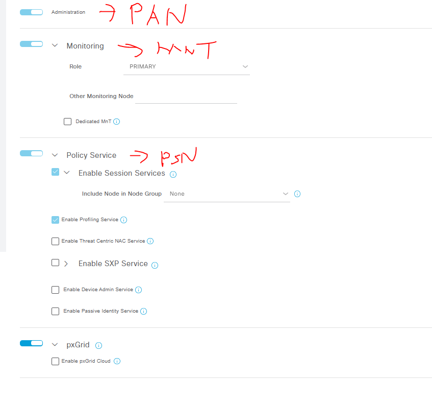 Policy Services Node(PSN) - Makes policy decisions, RADIUS/TACACS+ Servers