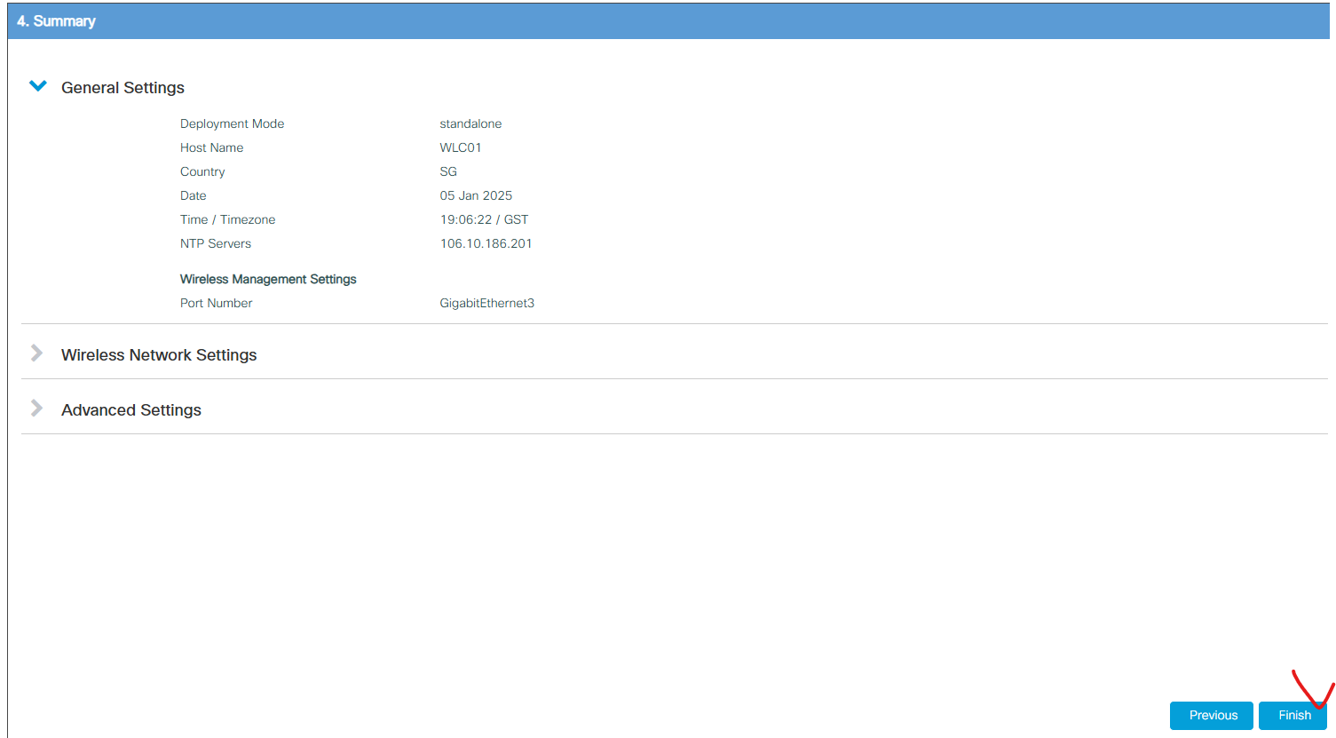 WLC# WLC# WLC#conf t Enter configuration commands, one per line. End with CNTL/Z. WLC(config)#vrf definition MGMT WLC(config-vrf)#address-family ipv4 WLC(config-vrf-af)#exit-address-family WLC(config-vrf)# WLC(config-vrf)#interface GigabitEthernet3 WLC(config-if)#no switchport WLC(config-if)#vrf forwarding MGMT WLC(config-if)#ip address 192.168.10.195 255.255.255.0 WLC(config-if)# WLC(config-if)#ip route vrf MGMT 0.0.0.0 0.0.0.0 192.168.10.253 WLC(config)# WLC(config)#username kevin privilege 15 secret Kenshin1022^^ WLC(config)# WLC(config)# WLC(config)# WLC(config)# *Jan 5 11:03:54.498: %LINEPROTO-5-UPDOWN: Line protocol on Interface GigabitEthernet3, changed state to down WLC(config)# WLC(config)# WLC(config)# *Jan 5 11:04:02.394: %LINK-3-UPDOWN: Interface GigabitEthernet3, changed state to up *Jan 5 11:04:03.393: %LINEPROTO-5-UPDOWN: Line protocol on Interface GigabitEthernet3, changed state to up WLC(config)# WLC(config)#end WLC#wr