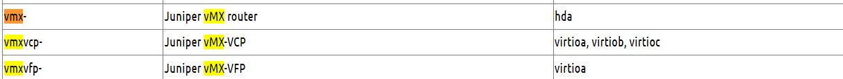 | vmxvcp- | Juniper vMX-VCP | virtioa, virtiob, virtioc |
