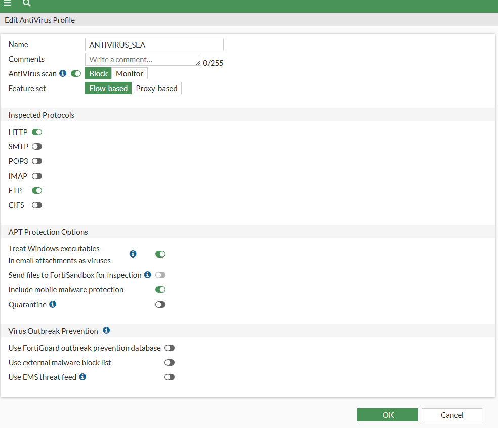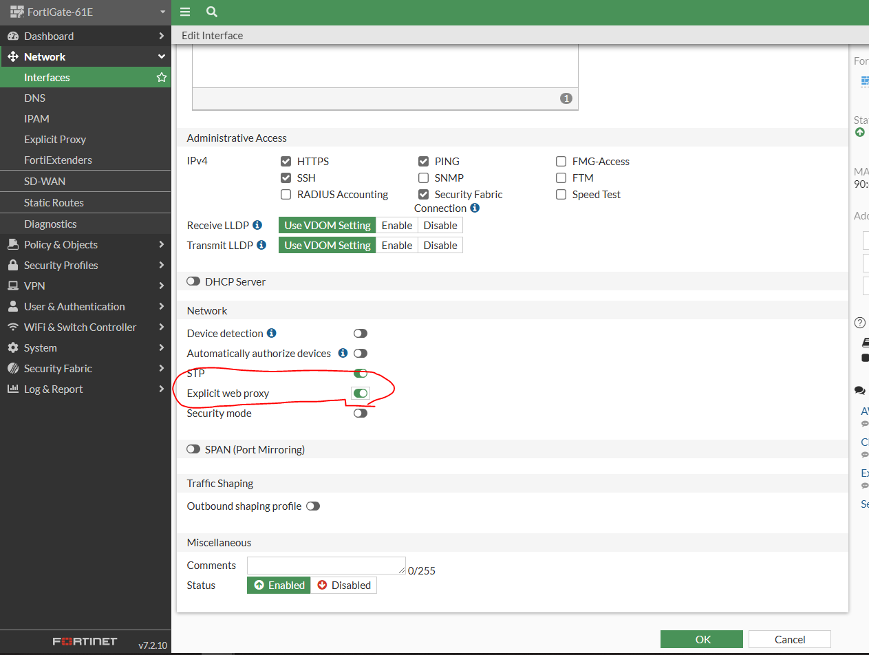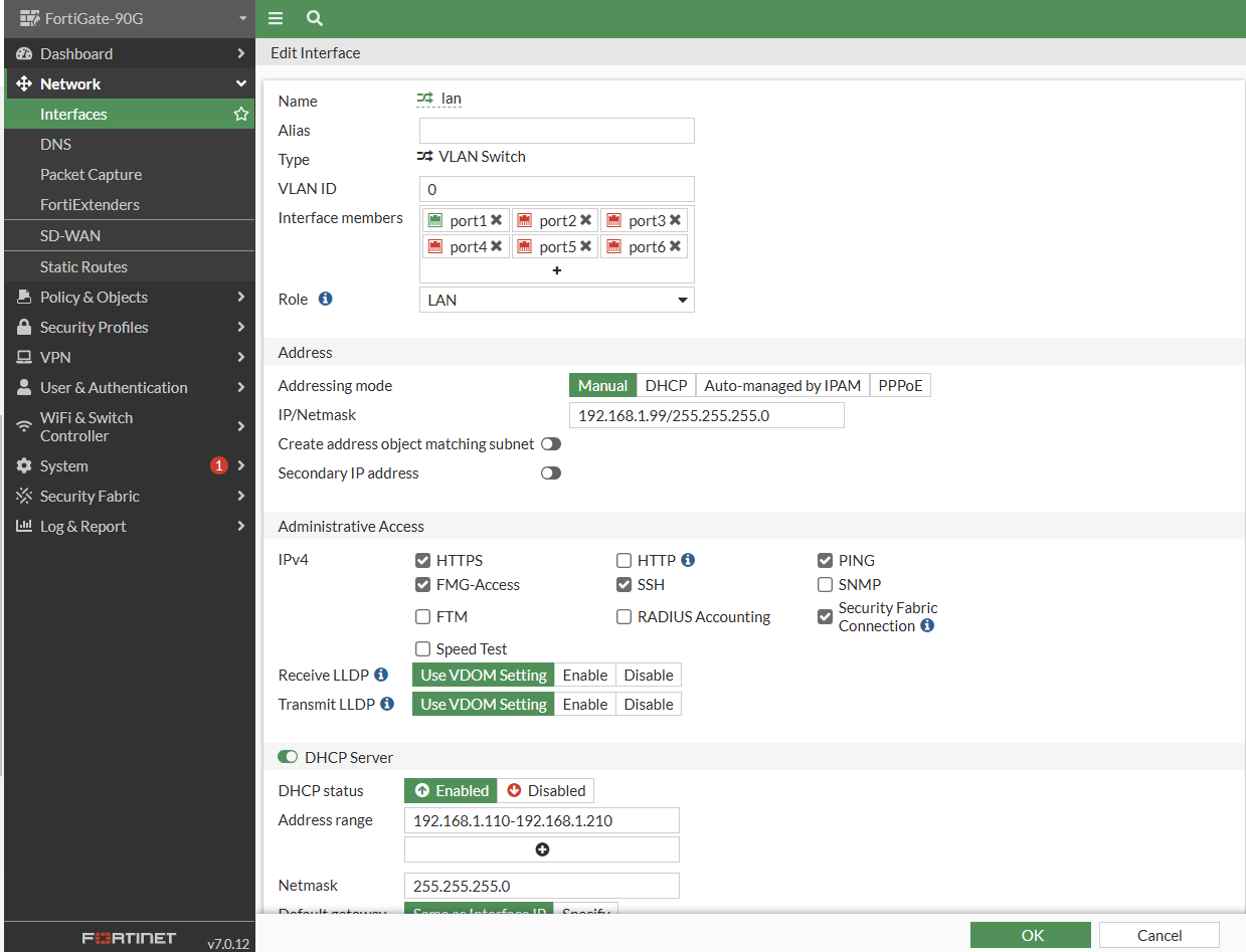 edit "lan" set vdom "root" set ip 192.168.1.99 255.255.255.0 set allowaccess ping https ssh fgfm fabric set type hard-switch set stp enable set role lan set snmp-index 15