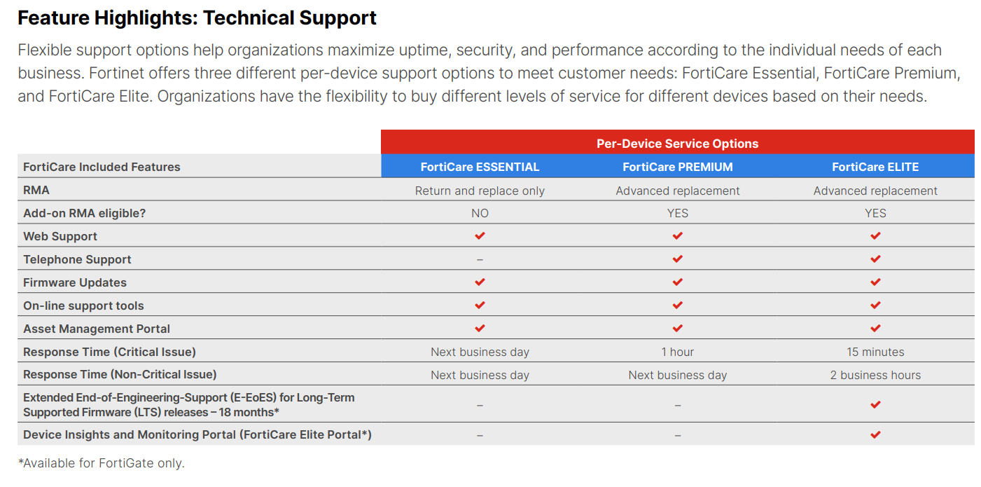 FortiCare Essential is the base-level service targeted toward devices that require a limited amount of support and can tolerate next-business-day, web-only response for critical as well as non-critical issues. This service is only offered to FortiGate models 9x and below and to low-end FortiWifi devices. RMA is on a return-and-replace basis at this service level