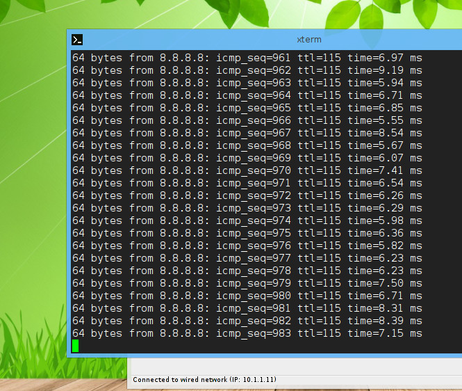 84 bytes from 10.1.1.1 icmp_seq=1 ttl=253 time=8.883 ms 84 bytes from 10.1.1.1 icmp_seq=2 ttl=253 time=7.573 ms 84 bytes from 10.1.1.1 icmp_seq=3 ttl=253 time=10.828 ms 84 bytes from 10.1.1.1 icmp_seq=4 ttl=253 time=12.965 ms 84 bytes from 10.1.1.1 icmp_seq=5 ttl=253 time=8.135 ms