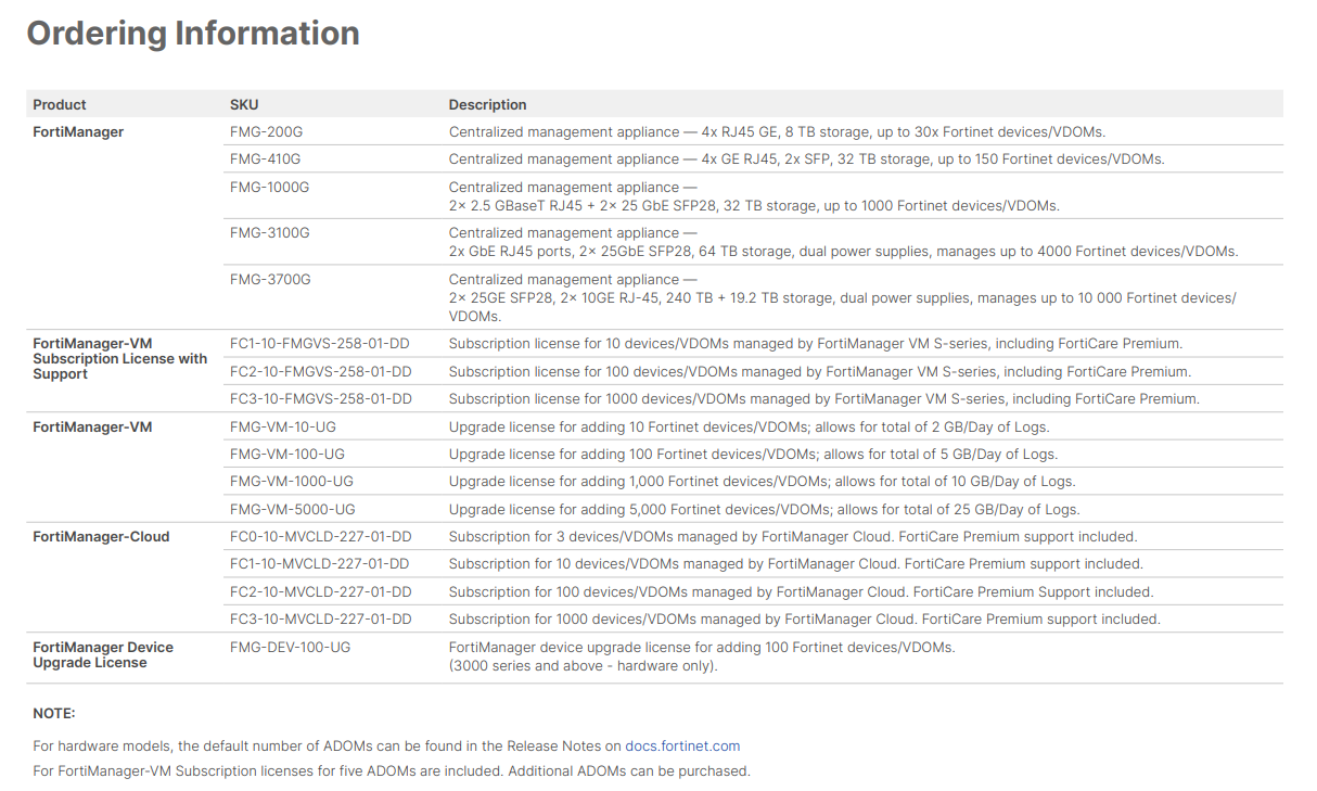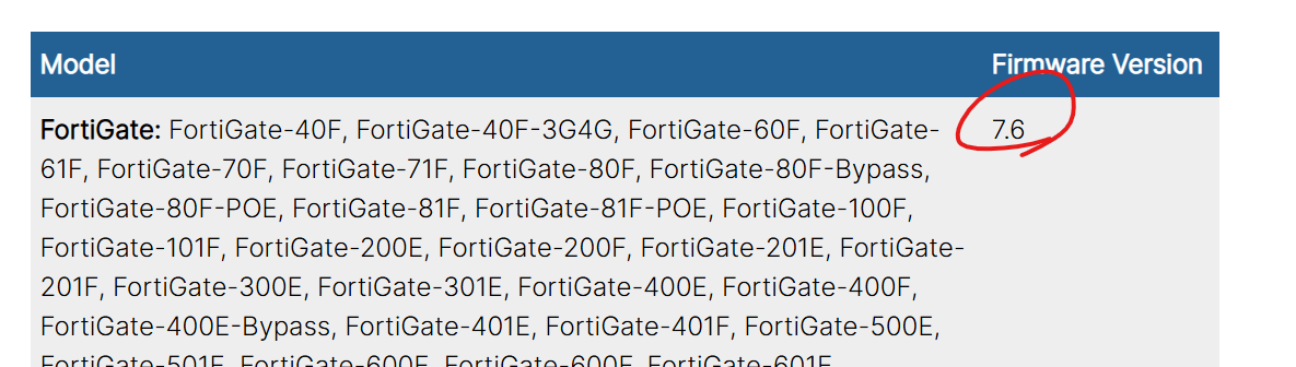 The following tables list which FortiGate, FortiCarrier, FortiDDoS, FortiAnalyzer, FortiMail, FortiSandbox, FortiSwitch ATCA, FortiWeb, FortiCache, FortiProxy, and FortiAuthenticator models and firmware versions that can be managed by a FortiManager or send logs to a FortiManager running version7.6.0.
