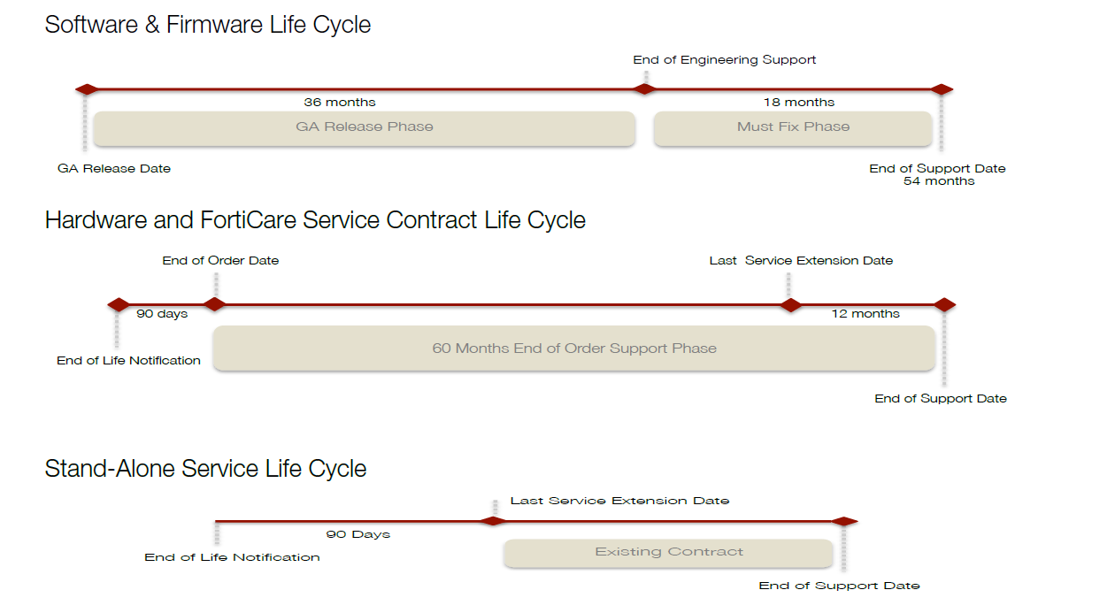 7. End of Support Date (EOS): The final milestone in the lifecycle is the End of Support date. After this date Fortinet, will not sell, manufacture or improve the product and is under no obligation to provide support services. In general the EOS takes place as follows: • Hardware - 60 months after the EOO Date • Software - 54 months after the GA date • Stand Alone Services – on the service contract termination date