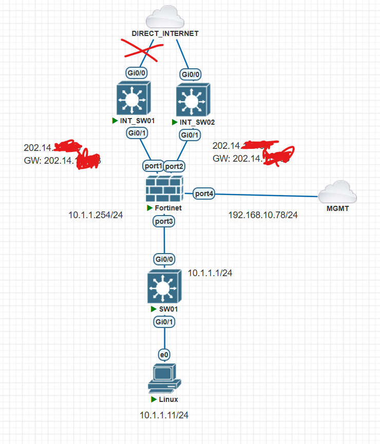 WAN02가 BACKUP internet으로 동작중에 INT-SW G0/0가 죽으면 Fortigate입장에서는 감지 할수 있는 방법이 없어서 계속 WAN01로 Traffic보내어서 PC가 통신이 불가능 합니다.