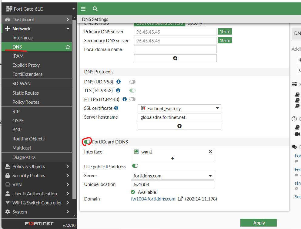 config system ddns edit 1 set ddns-server FortiGuardDDNS set ddns-domain "fw1004.float-zone.com" set use-public-ip enable set update-interval 60 set monitor-interface "port1" "port2"