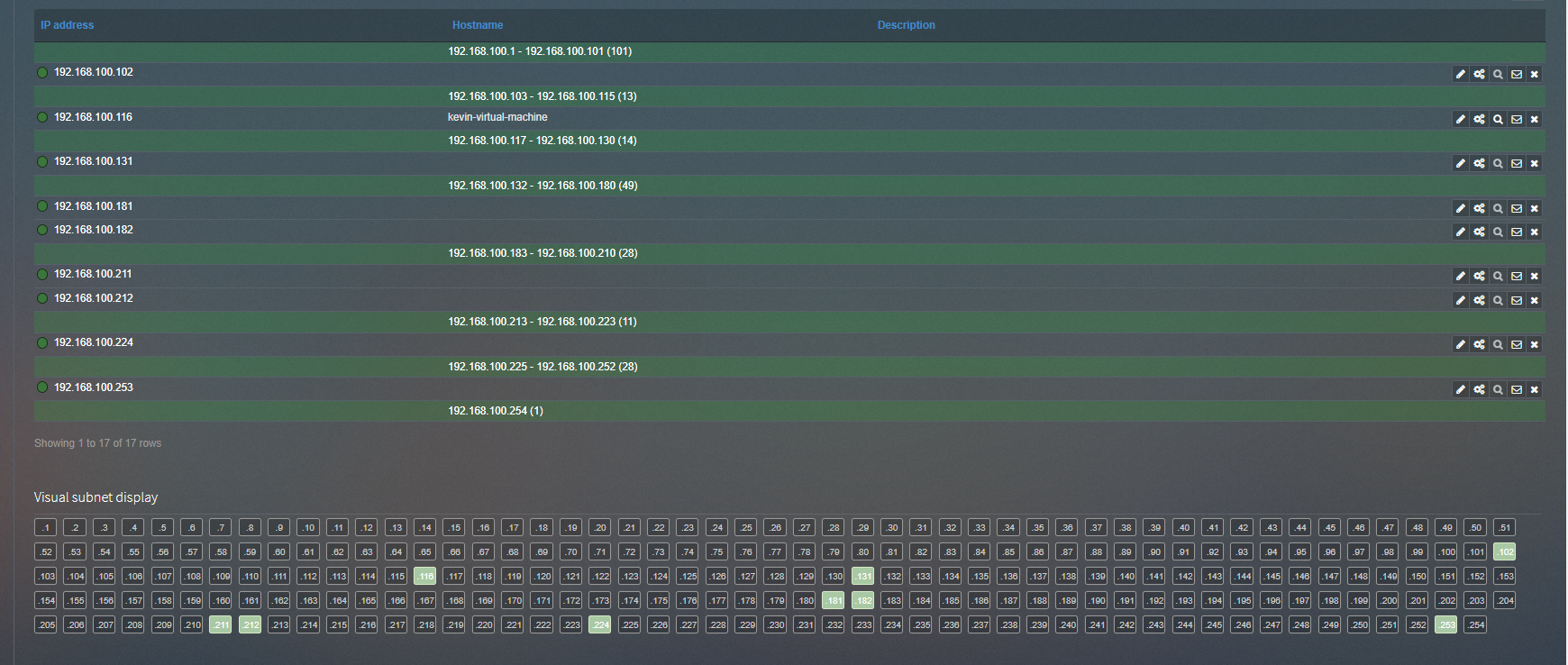 초록색이 현재 사용중인 IP주소를 표시 됩니다. 192.168.10.0/24 대역중에서 어떤 IP주소가 사용 중인지 확인 가능 합니다.