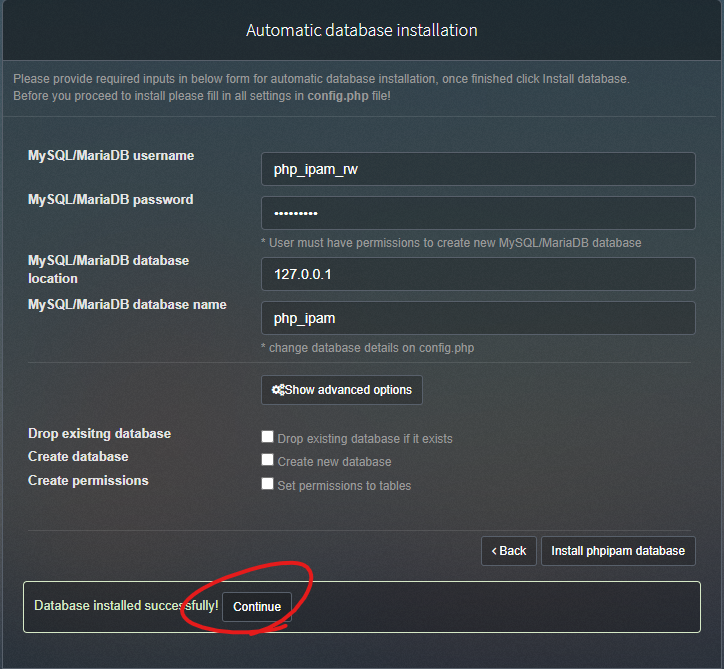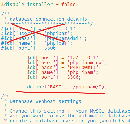 CREATE DATABASE php_ipam; GRANT ALL ON php_ipam.* to 'php_ipam_rw'@'localhost' IDENTIFIED BY 'P4P1p@m!!'; FLUSH PRIVILEGES; EXIT; exit