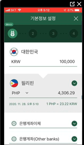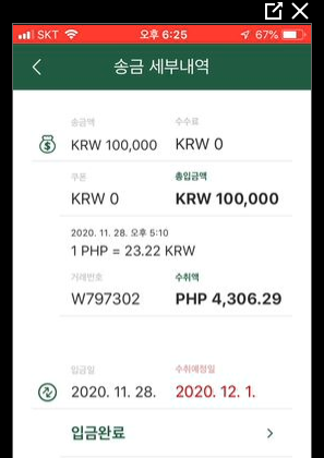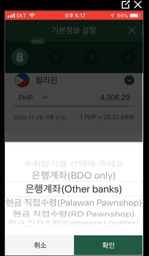 자동으로 필리핀 환율로 변환되어 얼마가 필리핀 통장에 송금될것인지 표시됩니다.