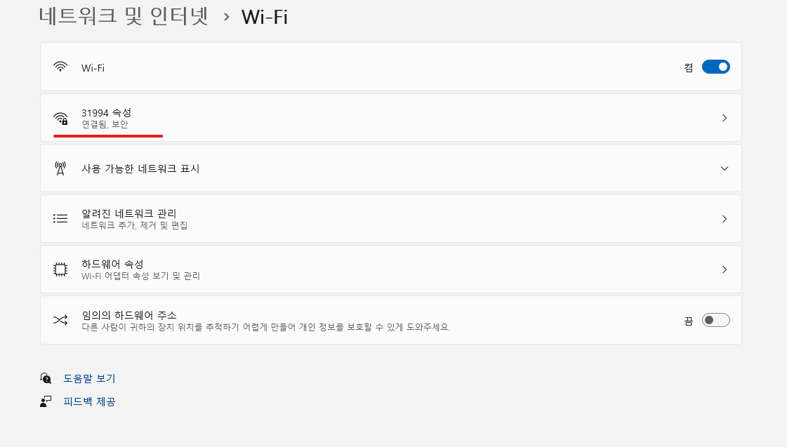 프로필 정보 ------------------- 버전 : 1 유형 : 무선 LAN 이름 : 31994 제어 옵션 : 연결 모드 : 자동 연결 네트워크 브로드캐스트: 이 네트워크가 브로드캐스트 중인 경우에만 연결 자동 전환 : 다른 네트워크로 전환 안 함 MAC 임의 지정 : 사용 안 함