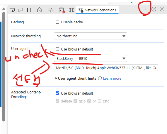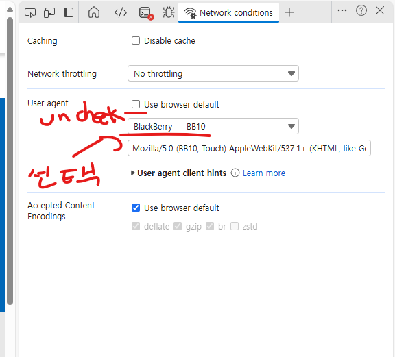 4. 아래 use browser default를 uncheck하고 아래처럼 BlackBerry --BB10 선택 합니다.