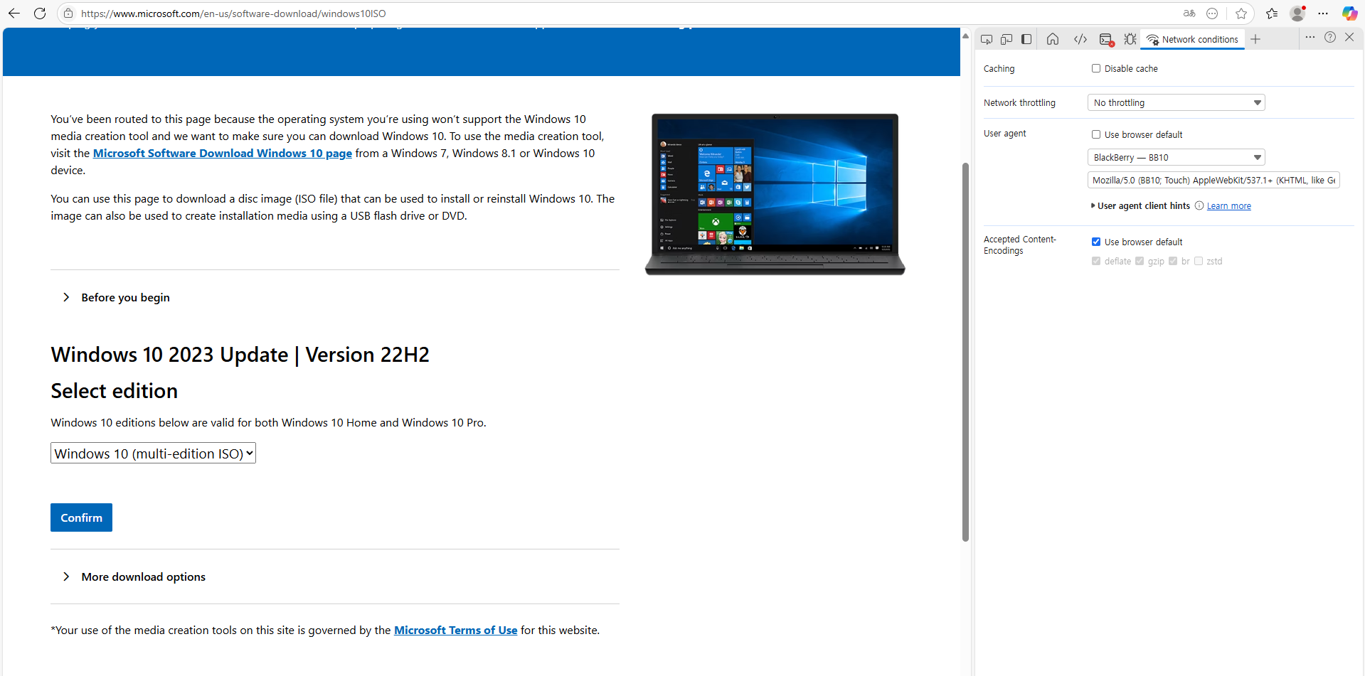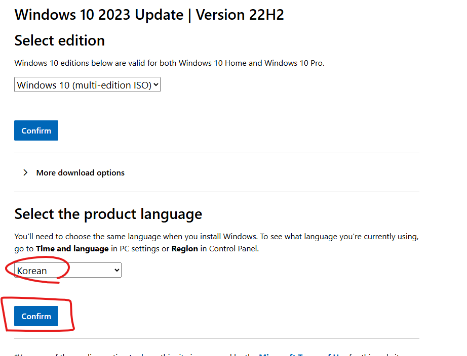 아래처럼 Windows 10 Multi-edition ISO 선택하고 Confirm를 누르면 ISO 다운로드 됩니다.